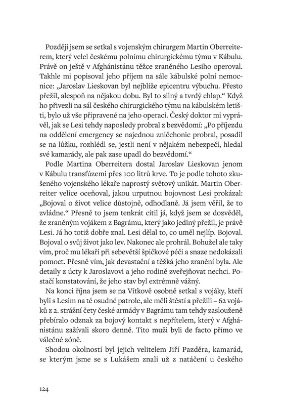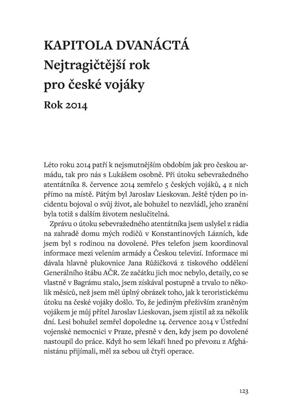 „Válka v Afghánistánu měnila životy nejen obyvatel této země, ale ovlivňovala dění v mnoha místech světa. Pro USA to byla nejdelší válka v historii, Česko v tomto konfliktu ztratilo nejvíc vojáků od 2. světové války. Málokdo sledoval české vojáky a jejich boj – se zbraní v ruce i o srdce a mysl místních obyvatel – z větší blízkosti než Karel Rožánek. V této unikátní knize zachycuje jejich příběhy i proměny Afghánistánu v průběhu dvaceti let války – jako vždy s neopakovatelnou přímostí a autenticitou.“