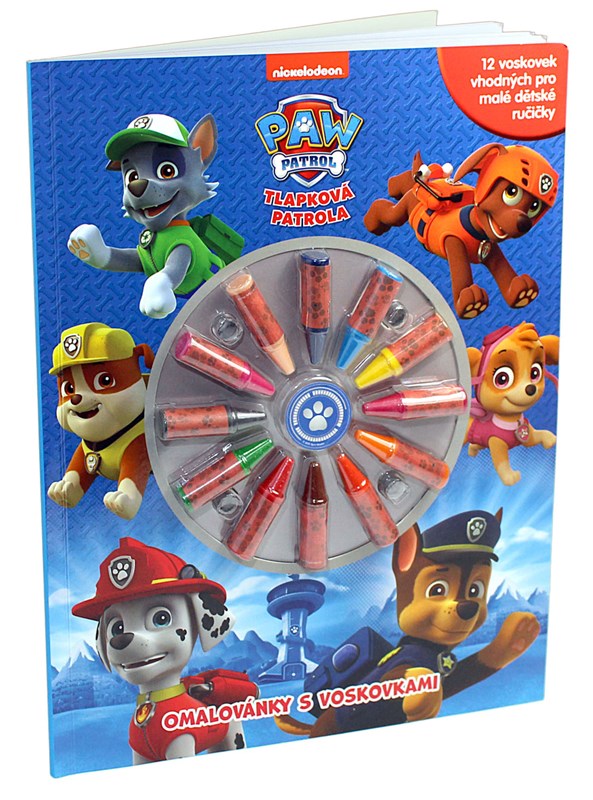 Parádní omalovánky s hravými štěňaty z Tlapkové patroly a 12 voskovek vhodných pro dětské ručičky