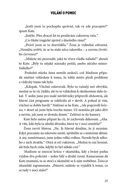 Oslavy čtvrtého července skončily, na oblohu, kterou v noci rozzářil ohňostroj, se vkrádá nový den a v zábavním parku Svět fantazie v Lost Creek je nalezeno tělo Nikki Jacksonové. Přivolaní policejní vyšetřovatelé usoudí, že šlo o sebevraždu – zoufalý čin mladé dívky, která ztratila veškerou naději. Nepodaří se jim ale najít nůž, který smrtelná zranění způsobil. A co znamená krvavý otisk prstu na dívčině čele?