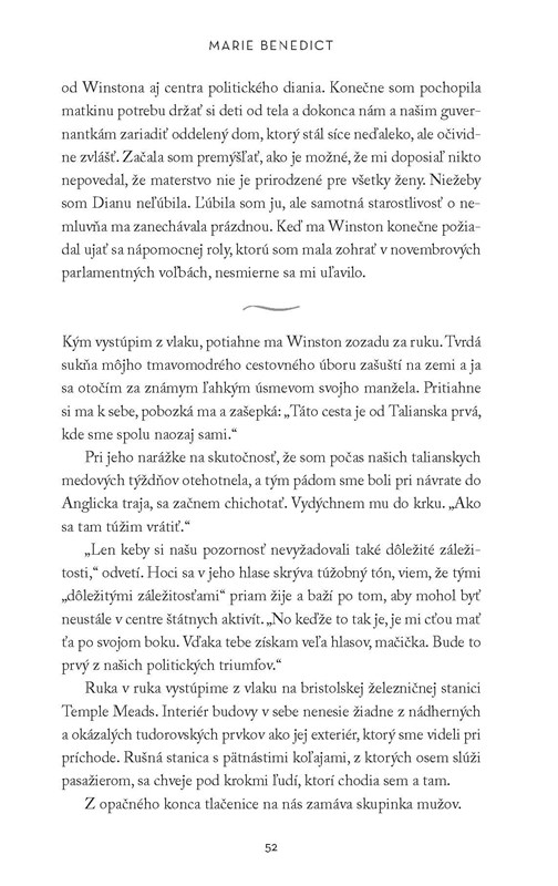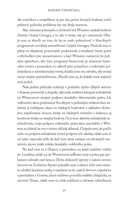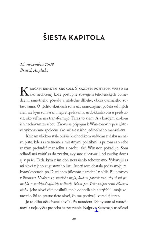 Keď sa mladá Clementine Hozierová vydala za Winstona Churchilla, geniálneho politika s progresívnymi názormi, vedela, že jej muž je predurčený stať sa veľkým vodcom celého národa. Ich manželstvo zďaleka nebolo len tradičným spojením muža a ženy. Clementine stála Winstonovi po boku nielen v rodine, ale aj v politike. Stala sa jeho radcom aj strážcom a neraz mu dokonca zachránila život.