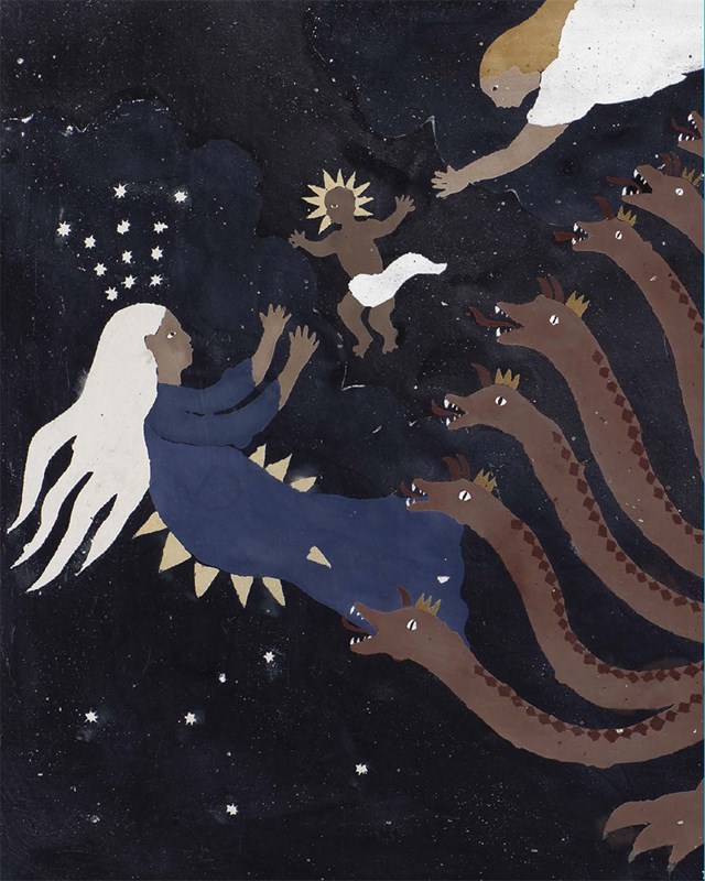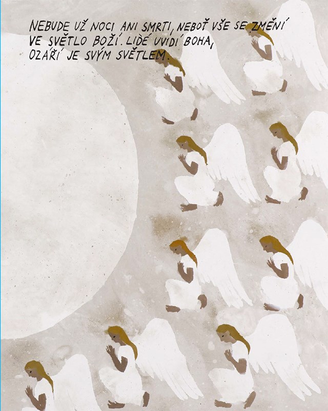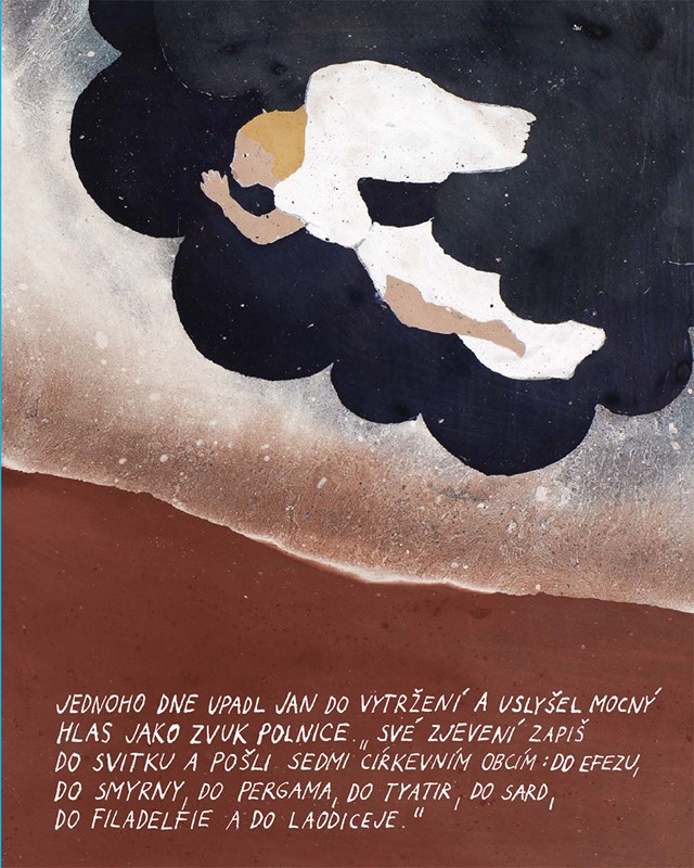 Monika Novotná, která namalovala první příběh z Bible Stvoření Světa a tedy první příběh edice, jej také završuje – velkolepými výjevy Janova zjevení, které namalovala pigmenty na kamenné desky. Pomůže nám tak nahlédnout do hlubokého a náročného textu.