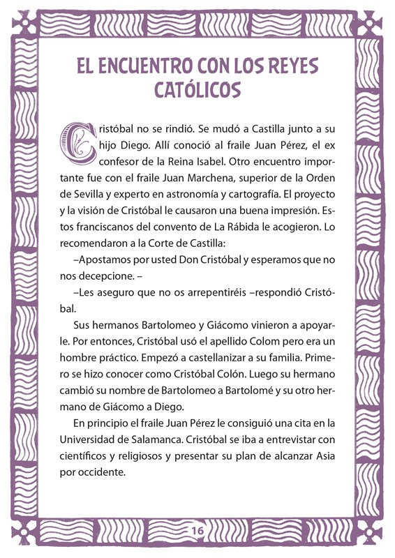 V této knize máte možnost přečíst si o životě a o cestách Kryštofa Kolumba ve španělštině. Nemusíte se však obávat, že byste textu neporozuměli. Je napsaný zjednodušenou španělštinou tak, aby vyhovoval potřebám začínajícího čtenáře. Na každé stránce naleznete český zrcadlový překlad a na webu si můžete stáhnout nahrávku namluvenou rodilým mluvčím. Cvičení na konci knihy jsou vhodná pro ověření získaných znalostí.