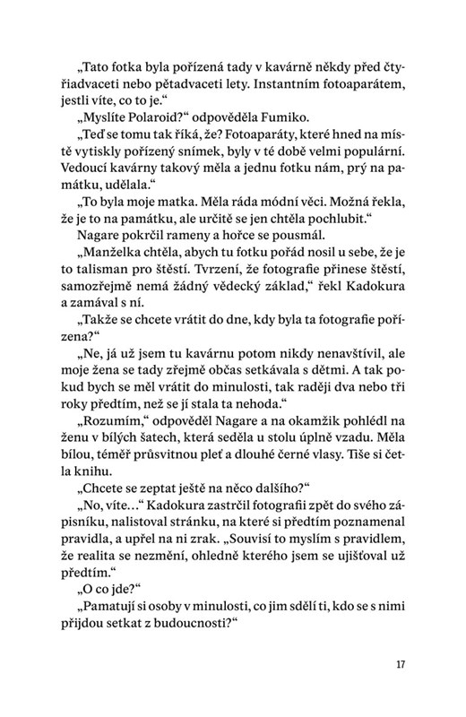 Čtvrtý díl série o podivné kavárně, v níž je možné se vrátit do minulosti, bude možná pro mnohé čtenáře překvapením. V předchozím dílu, Než vzpomínky vyblednou, se děj přesunul do kavárny Dona dona ve městě Hakodate na ostrově Hokkaidó. Nyní se nejen vrací zpět do tokijské kavárny Funiculi funicula, ale vrací se i v čase, do období mezi dějem prvního a druhého dílu.