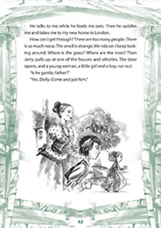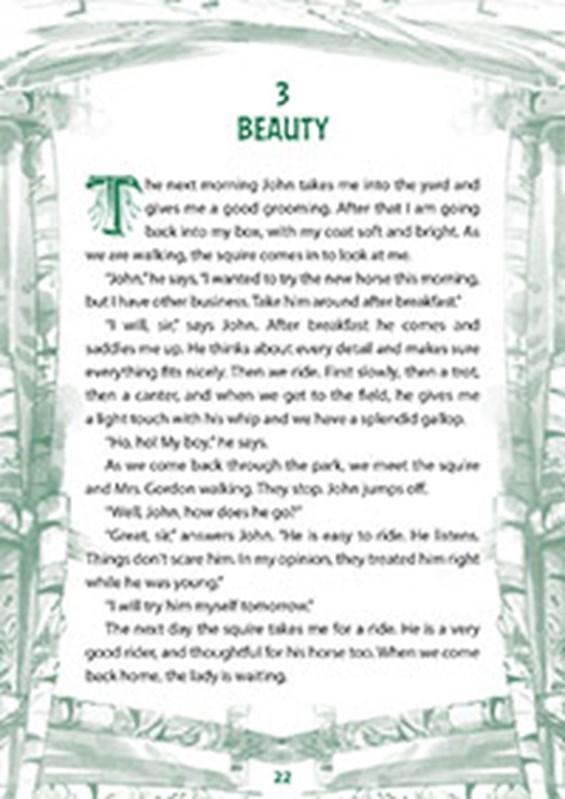 Děj se odehrává ve viktoriánské Anglii, v době, kdy koně byli klíčoví, jelikož byli pro lidi hlavním dopravním prostředkem. Nicméně, nebylo s nimi vždy zacházeno správně. Černý krasavec od raného věku přichází na to, že lidé mohou být buď nejlepším spojencem koně, nebo jeho největším nepřítelem. Příběh je převyprávěn zjednodušenou angličtinou, a proto se nemusíte obávat, že byste textu neporozuměli. Je výbornou volbou pro začínajícího čtenáře, ať dítě či dospělého. Na každé stránce naleznete český zrcadlový překlad. V úvodu knihy se seznámíte s nejdůležitějšími termíny, zjistíte tak více například o postroji koně nebo jeho vzhledu.