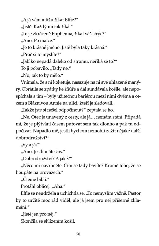 V roce 1930 vedla touha po lepším životě poslední obyvatele nehostinného, skalnatého souostroví St Kilda k žádosti o přesídlení na skotskou pevninu. Pro divokou Effie je to hořkosladký odchod – svými lezeckými schopnosti se vyrovná každému muži na ostrově, což není v jejím novém „domově“ nijak ceněno. Díky svým obsáhlým znalostem mořských ptáků však získává místo kurátorky ornitologické sbírky hraběte z Dumfriesu. Může se tak vrátit do náruče jeho syna, mladého lorda Sholta, jehož průvodkyní po ostrově měla tu čest na jaře být a k němuž ji poutá nezpochybnitelná přitažlivost. V upjaté společnosti skotské smetánky je ovšem více než zřejmé, jak moc se jejich světy odlišují. Když je na ostrově objeveno tělo, krátce po přesídlení původních obyvatel, vypukne skandál, do něhož je Effie zapletena. Sholto tuší, že cosi skrývá – jsou však ta tajemství vůbec její?