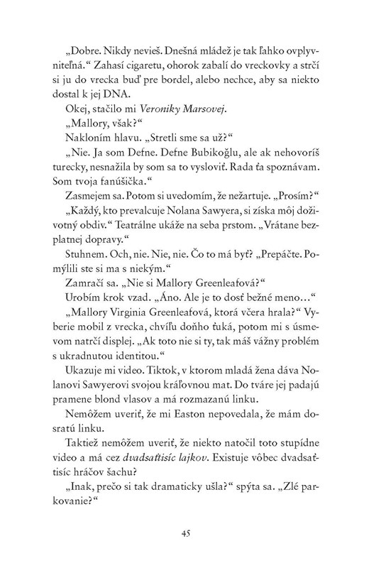 Mallory Greenleafová so šachom skončila. Potom čo tento šport pred štyrmi rokmi viedol k rozvratu jej rodiny, venuje sa svojej mame, sestrám a práci. Teda až do chvíle, keď neochotne súhlasí, že si zahrá na poslednom charitatívnom turnaji. Nechtiac sa stretne s Nolanom Sawyerom, súčasným majstrom sveta a úradujúcim šachovým bad boyom.