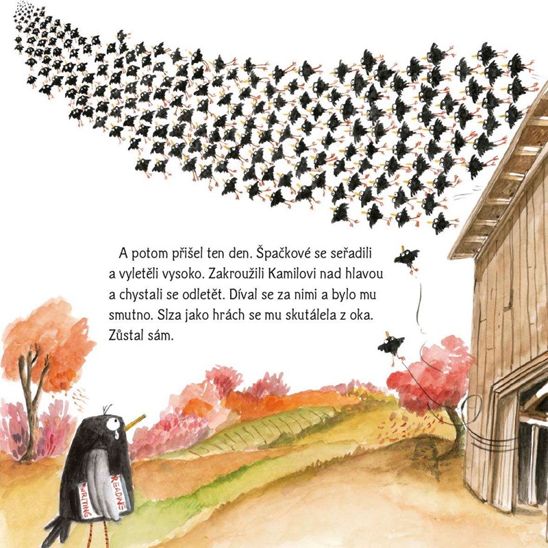 A potom přišel ten den. Špačkové se seřadili a vyletěli vysoko. A co Kamil, neuměl lítat. Odletěl s nimi?