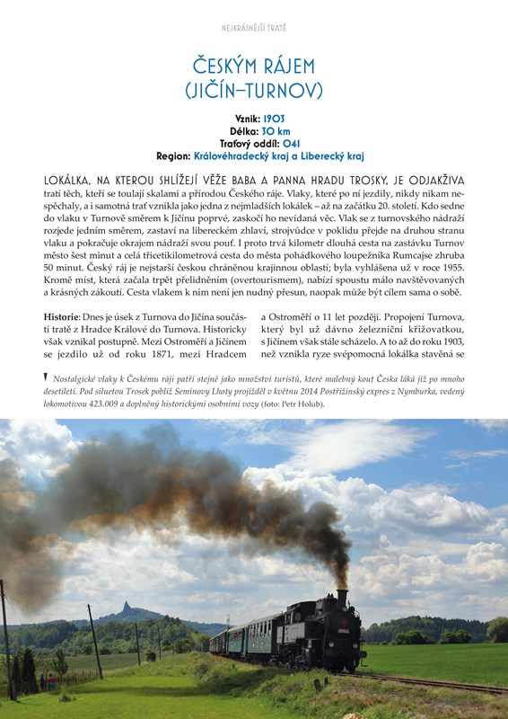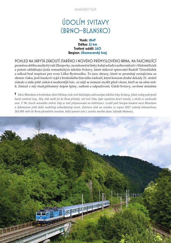 Sevřená údolí a tratě šplhající do horských sedel, dlouhé tunely a impozantní viadukty, velká nádraží i většinu času liduprázdná nádražíčka. Česká železnice je rozmanitá, a přestože trpí mnohými neduhy, je krásná. A přesně takovou se ji snaží ukázat i tato kniha. Autor vybral téměř čtyři desítky tratí, o nichž lze tvrdit, že patří k těm nejkrásnějším. Každou z nich doprovázejí současné fotografie špičkových autorů, kteří rádi postávají u trati, vyhledávají fotogenická místa a čekají, až vlak projede krajinou či nádražím. Kdo z nás nezažil ten pocit a vzrušení, když kolem něj projel vlak?