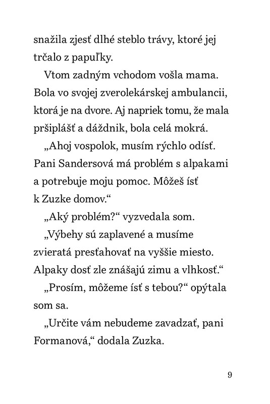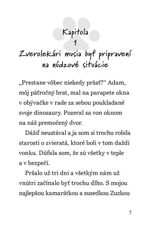 UĹľ niekoÄľko dnĂ pršà a farmy s vĂ˝behmi v okolĂ nášho domu sĂş zaplavenĂ©. KeÄŹ zavolajĂş mamu, aby vyslobodila uviaznutĂ© alpaky – veterinár musĂ byĹĄ predsa vĹľdy pripravenĂ˝ vyraziĹĄ – so Zuzkou sme odhodlanĂ© pomĂ´cĹĄ. ZachrániĹĄ totiĹľ treba veÄľa malĂ˝ch zvieratiek. PresvedÄŤĂme otca, aby s nami vyrazil na kanoe, skĂ´r ako hladina vody ešte viac stĂşpne?