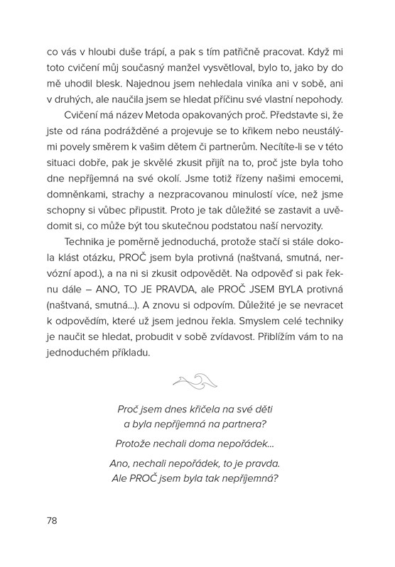 Jste často unavená a přestaly vás bavit věci, které vás dříve naplňovaly? Berou ostatní jako samozřejmost všechno, co pro ně děláte? Bouchnete někdy při hádkách jako papiňák a pak si to vyčítáte? Olga Studničková Šípková a Milan Studnička vám ukážou, jak vystoupit z tohoto začarovaného kruhu. Díky jejich tipům a zkušenostem zjistíte, jak vychovávat děti s lehkostí, jak si udržet harmonický vztah i jak s nadhledem řešit nepříjemné situace. Osvojte si nový přístup a najděte zase chuť do života!