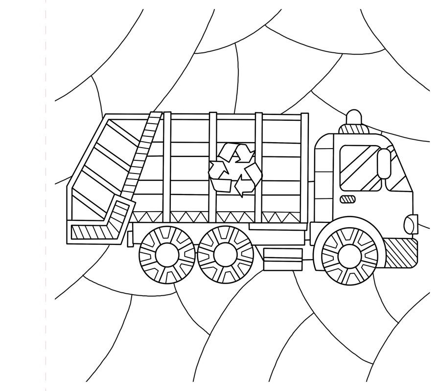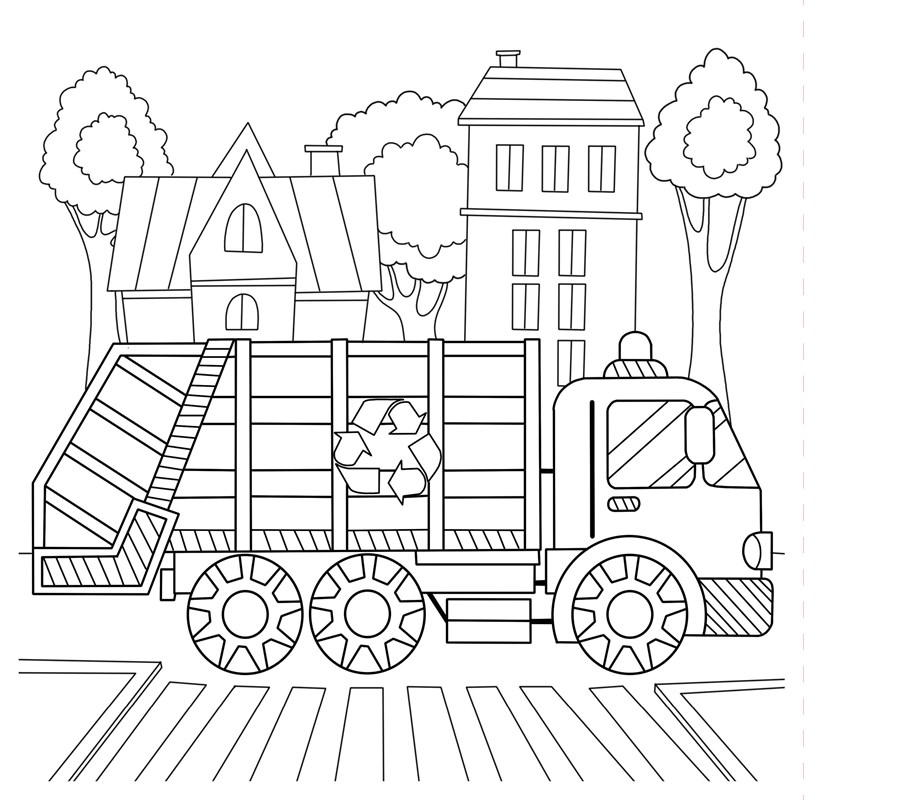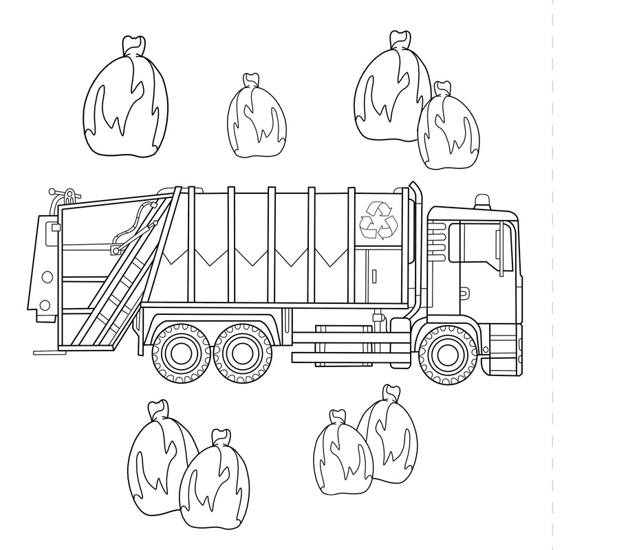v nich mnoho typů popelářských aut, která netrpělivě čekají