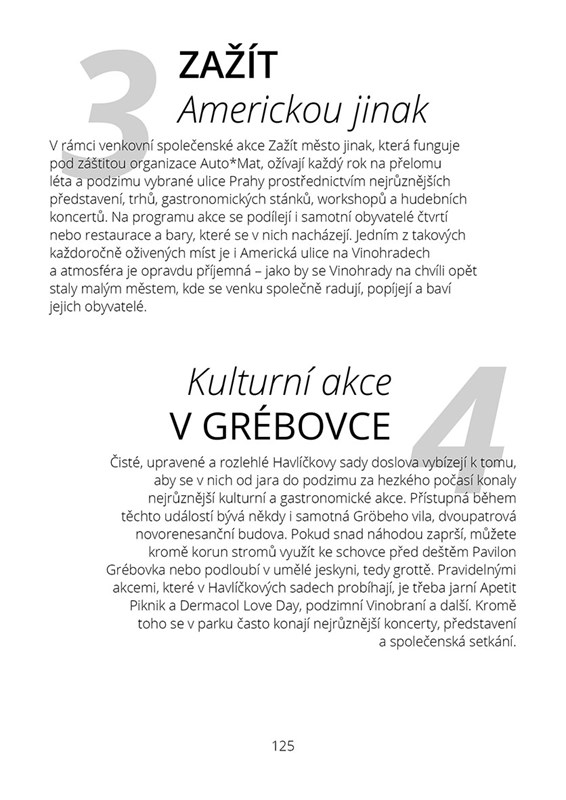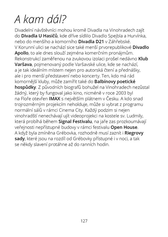 mnoho – a jejich tvůrci odvedli skvělou práci. V této knize se ovšem zaměříme na Vinohrady dnešní. To neznamená, že by snad autorka opomenula známé stavby nebo vývoj čtvrti. Hlavním cílem ovšem bylo nahlédnout na Vinohrady pohledem člověka, který ve čtvrti žije a zároveň si ji užívá – kouká kolem