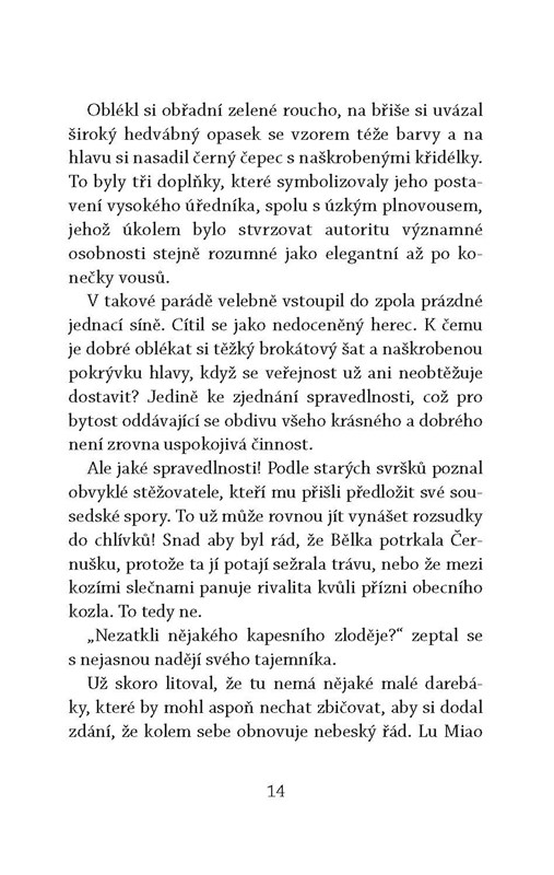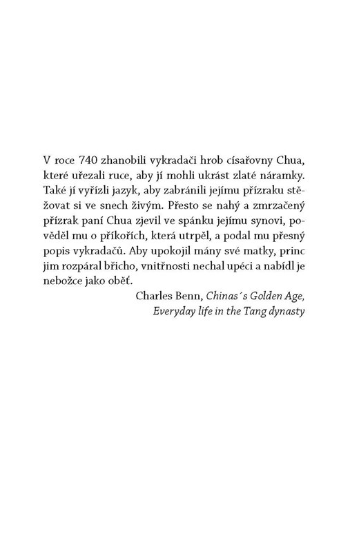 Existuje souvislost mezi vraždou válečného hrdiny rozřezaného na kusy, podezřelými aktivitami věhlasného kaligrafa, záhadným zmizením sbírky nefritů a nejasnostmi v manželství obchodníka s čajovými konvicemi? Zatímco v jeho podprefektuře padají hlavy, soudce Ti se snaží zjistit, co skrývá choť dovozce čajových konvic, překrásná paní Li. Jako by samotné vyšetřování těchto vražd nestačilo, mandarína každou noc povolává přízrak a vyžaduje způsobný pohřeb. S rozplétáním příze této navýsost čínsky důmyslné zápletky ctihodnému soudci Ti pomáhá jeho věrný pobočník Tao Kan, nenapravitelný kapsář neschopný opustit svědkův příbytek s prázdnými kapsami.
