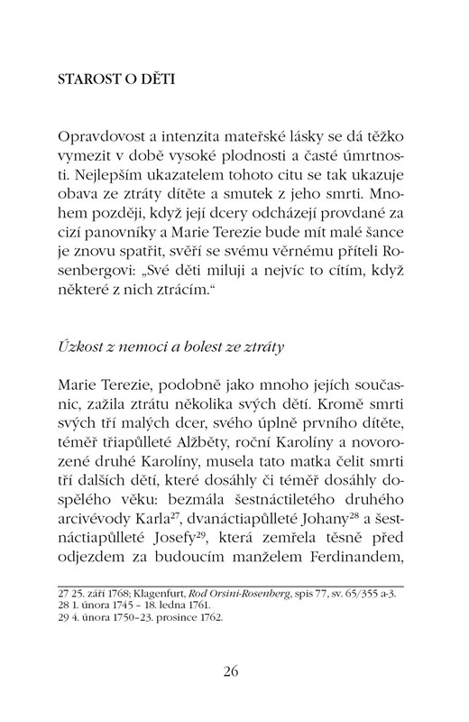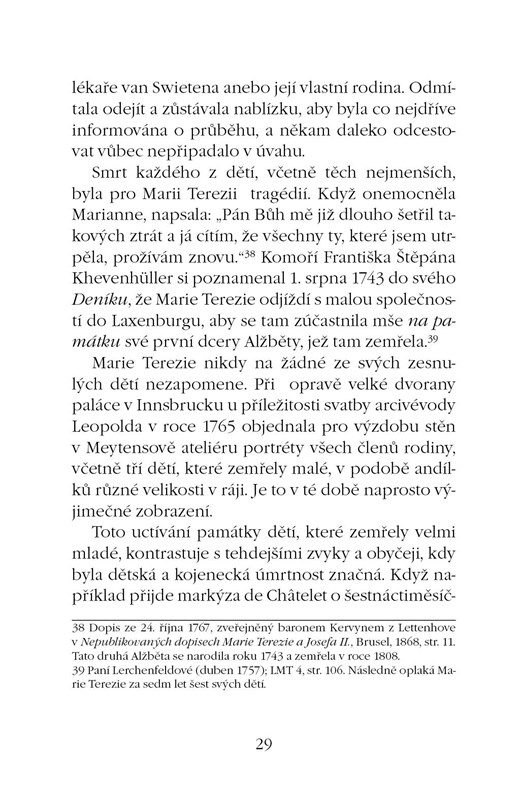 Ve své poslední knize se francouzská psycholožka věnuje fascinující osobnosti rakouské císařovny Marie Terezie, výjimečné ženy v dějinách, která dokázala skloubit politickou dráhu panovnice mocného státního útvaru a roli matky, úzkostlivě pečující o výchovu svých dětí. Studium historických materiálů v archivech (díky českým šlechtičnám pohybujícím se v okolí císařovny pochází mnoho dokumentů z českých archivů) umožnilo autorce vykreslit obraz Marie Terezie jako důkladné a starostlivé matky, někdy vůči svým dětem i velmi přísné a tvrdě upřímné. Čtenáři se dozví, jaké pokyny Marie Terezie udílela vychovatelům, jak prožívala nemoci svých dětí i které ze svých potomků upřednostňovala s ohledem na zájmy monarchie. Srdce Marie Terezie patřilo jak jejím dětem, jejichž výchova se vymykala dobovým zvyklostem u panovnic a aristokratkám její úrovně, tak monarchii, které vládla. Výchova dětí s ohledem na zájmy Rakouska-Uherska přitom nemohly uniknout častým konfliktům a nevraživostem i mezi potomky, ale nejmocnější vládkyně tehdejší Evropy se je vždy snažila řešit s láskou, diplomacií a noblesou.