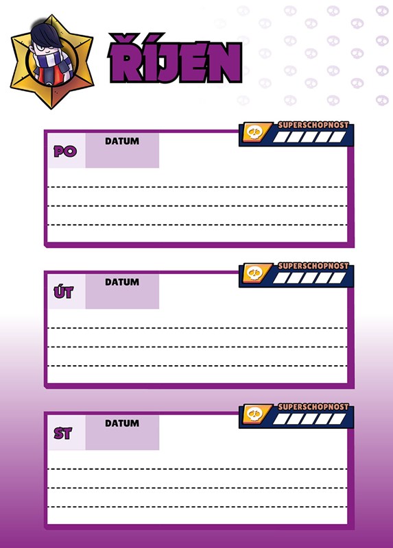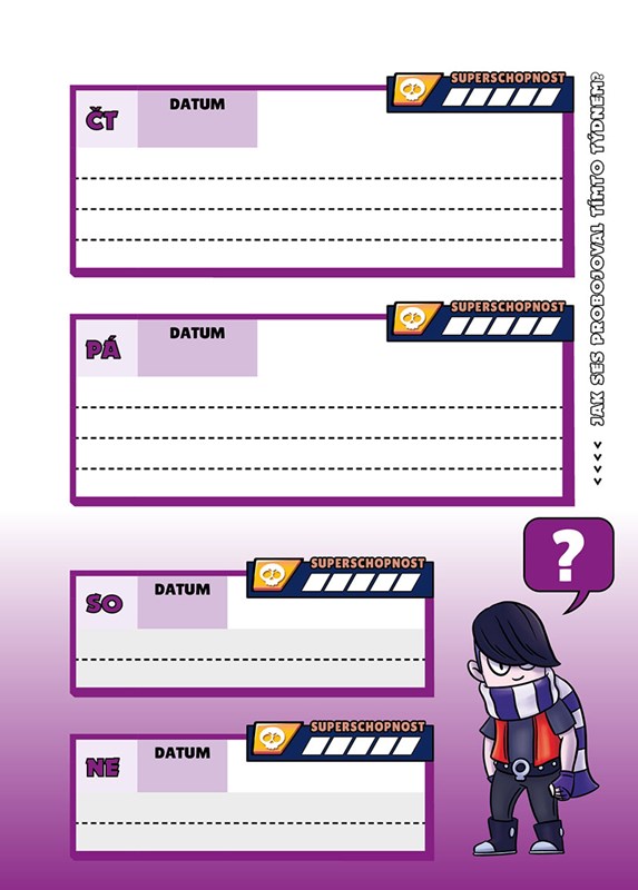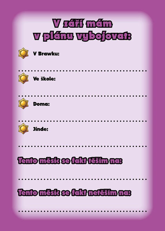 Najdeš v něm nejen praktický týdenní diář na jakýkoliv školní rok, barevný rozvrh hodin a přehledný roční plánovač, ale především spoustu svých oblíbených brawlerů, kteří trousí vtipné hlášky a v záloze pro tebe mají hromadu naprosto nepostradatelných taháků!