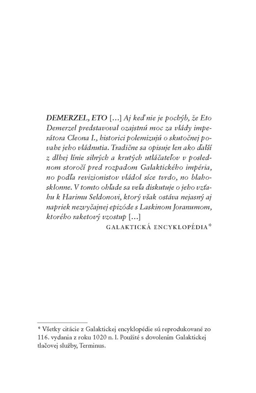 Píše sa rok 12 020 n. l. a imperátor Cleon nepokojne sedí na tróne v Trantore. V hlavnom meste galak...