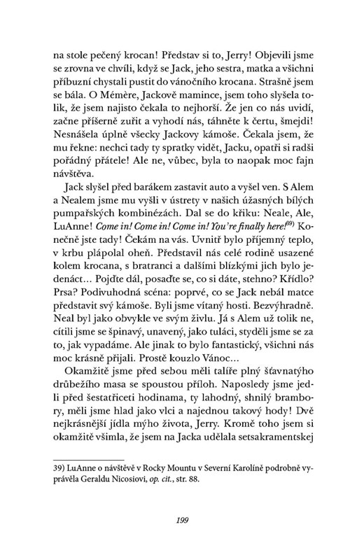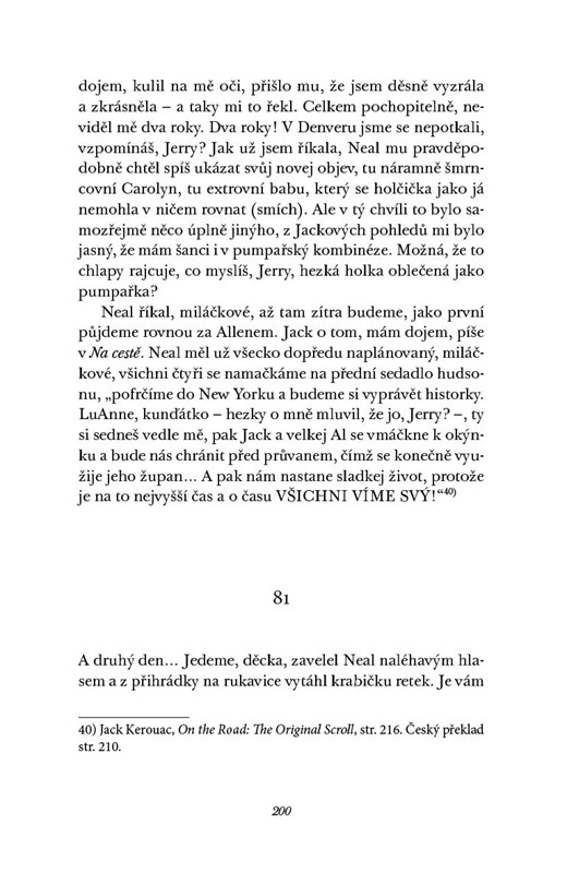 Neal Cassady se do mladičké krasavice LuAnne Henderson zamiloval na první pohled, v jejích patnácti letech se s ní oženil, a tak započal jejich společný život plný odvážných kousků, nevázané lásky i chudoby. Mladý delikvent a specialista na krádeže aut Neal se sice nestal slavným spisovatelem, jak o tom se svou ženuškou snili, ale beatnická generace rebelských amerických intelektuálů tohoto "mrdálistu a denverského Adónise", jak ho zvěčnil Ginsberg v Kvílení, pasovala na svého "tajného hrdinu". Páreček spolu s předním beatnikem Kerouacem vytvořil trojku, která procestovala Ameriku, nejen v legendárním auťáku Hudson 49, a stala se svobodomyslným idolem všech čtenářů Jackova bestselleru Na cestě. Jeho příběh nám citlivě převyprávěl odborník nejkvalifikovanější, tentokrát ovšem pohledem ženského protějšku obou mužských hrdinů.