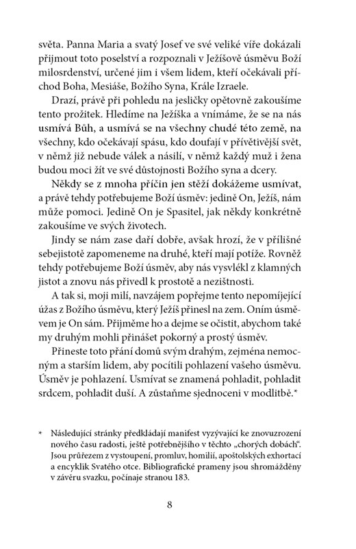 Radost je ústředním tématem celého pontifikátu papeže Františka – tématem, které je „v těchto nemocných časech ještě potřebnější“. Ve vybraných promluvách, které najdete na stránkách této knihy, přináší papež František radostnou zvěst o znovuzrození každému člověku. V knize rozčleněné do osmi kapitol rozebírá hlubokými a velmi lidskými slovy téma radosti s vědomím, že skutečná radost není pomíjivý pocit ani iluzorní protilátka pro ty, kdo ignorují utrpení: rodí se z konkrétní naděje, o kterou nás nikdo a nic nemůže připravit.