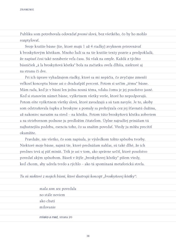 Okrem riadených cvičení sa v publikácii dočítate aj čo-to o autorkinom živote, pretože niektoré cvičenia obsahujú v úvode jej osobnejší príhovor (náhľad do jej života) ku konkrétnej téme. Napríklad v cvičení číslo 5 s názvom Broskyňové kôstky, autorka spomína, že prežila sexuálne zneužívanie aj fyzické týranie a vyrastala s pocitom, že je neviditeľná a jej hlas nie je vypočutý. Poskytne nám aj náhľad do toho, ako vznikajú jej básne a koľko času a úsilia jej zaberie napísať kratšie texty.