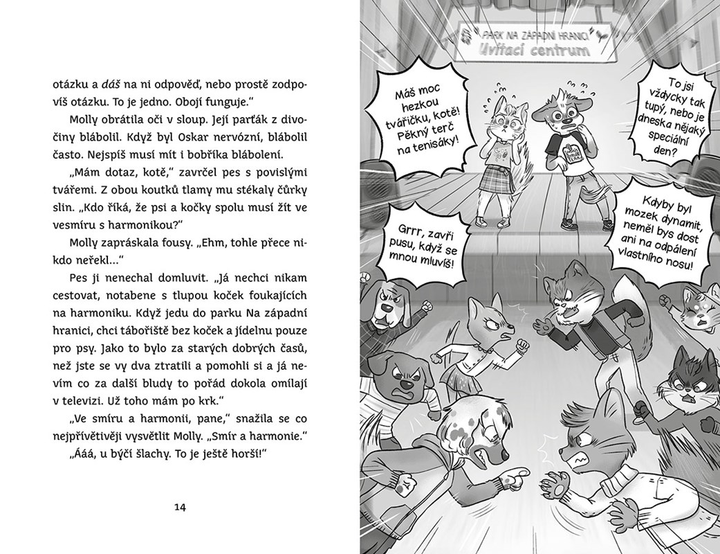 Kočku Molly, zkušenou stopařku protřelou divočinou, a psa Oskara čeká kempování s rodinami – rodiči, sourozenci, bratranci, sestřenicemi, strýčky i tetami – v rezervaci ve Východní divočině. Ale pozor, kočky nechť odpočívají v kočičí zóně, psi musí čenichat zase ve své. Překračování okrsků je ZAKÁZÁNO a pro tyhle zvířecí rivaly to platí dvojnásob!