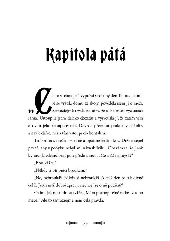 Vytvarovat meč vyžaduje nekonečné hodiny kování kladivem. Nejdříve je to jen rozžhavená hrouda ocele. Musí se znovu a znovu roztloukat a zahřívat, dokud ho nezploštíte do toho správného tvaru. Trik spočívá v tom, že ocel musí mít právě tu správnou teplotu a musíte do ní bušit právě tou správnou silou – dost silně, aby se vytvarovala, ale zároveň dost opatrně, aby se nezlomila. Kovář, u kterého jsem se učila, mi řekl, že ovládnout tohle umění zabere desítky let, takže buďto jsem génius, anebo mé instinkty pomáhá vést mé magické nadání.