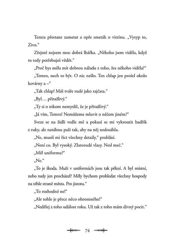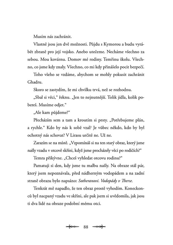 Je svázána s mými smysly. Se zvukem mého hlasu. S teplem mého dechu. S vášní v mých očích. S tím, jak konejšivě hladím kov a naslouchám jeho řeči. Většinu času si to přímo neuvědomuji, ale naučila jsem se, že na ocel rozpálenou v ohni se nesmí křičet ani jí spílat. Je třeba ji tvarovat něžným šepotem a povzbuzováním.