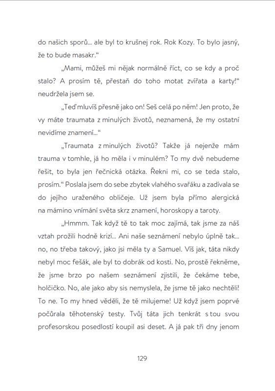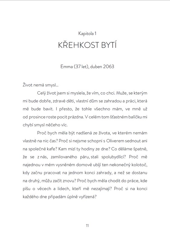 Po smrti Patricie pociťuje Emma, že cesta ze smutku není rovná dlážděná ulička, ale klikatá serpentýna, kde za každou zatáčkou číhají nové obavy. Rozhodne se skončit ve své práci a začne se naplno věnovat tomu, co miluje. Psaní. Je to ale ten správný krok? Při psaní si uvědomí, jak rozdílně lze člověka vnímat, když ho necháme, aby nám vyprávěl část svého života z vlastního pohledu a neaplikujeme na něj svá očekávání a předsudky. Když máme tu čest nahlédnout mu do duše a zjistit, jaké okamžiky ho formovaly, a proč se stal člověkem, jakým se stal. Máme vůbec šanci nestát se kopiemi našich rodičů?