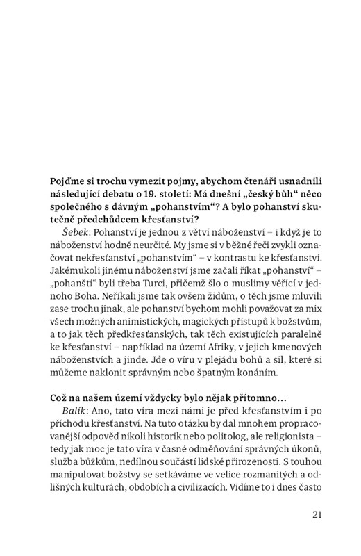 Rozhovor, který vedl Zdeněk Jančařík s historikem Jaroslavem Šebkem a Stanislavem Balíkem, je pohledem na české dějiny od samotných počátků až do současnosti. Zasvěcený a živý trojrozhovor se zaměřuje na ústřední otázku: jak je to s vírou a nevírou Čechů, často považovaných za jeden z nejateističtějších národů Evropy? K nejdůležitějším tématům patří příchod křesťanství a přetrvávání pohanství, husitské reformní hnutí a ničivé husitské války, baroko, osvícenství a národní obrození, První republika, křesťané za komunistického režimu, reformní 60. léta i skrytá církev. Nechybí klíčové postavy pro vztah Čechů k víře a náboženství: Palacký, Masaryk, Jirásek, kardinálové Beran a Tomášek. K zajímavosti knihy přispívají i vložené rozhovory s jezuitou Miroslavem Heroldem, publicistou a spisovatelem Jiřím Peňásem a filosofkou Terezou Matějčkovou.