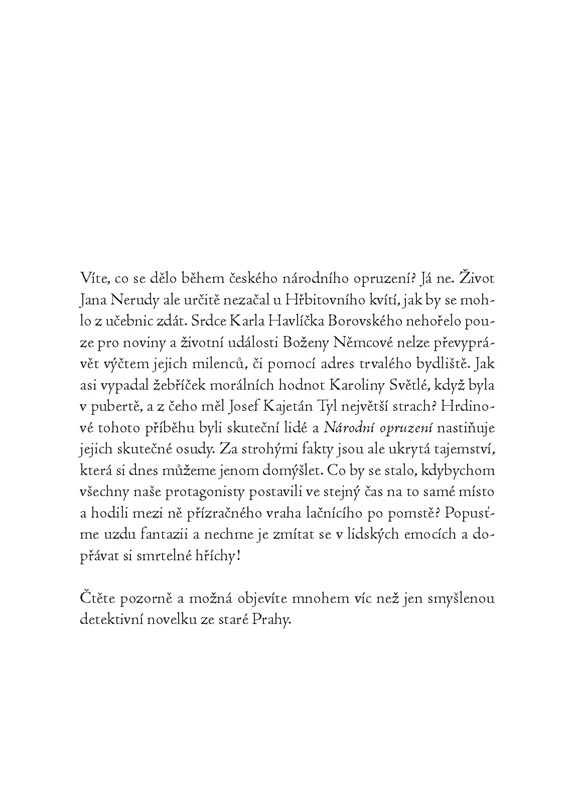 Detektivka s romantickou zápletkou postavená na historických událostech českého národního obrození vypráví příběh, kdy Neruda byl ještě kluk, Světlá neměla zábrany, Němcová toužila po lásce a Havlíčkova drzost hýbala s dobou.