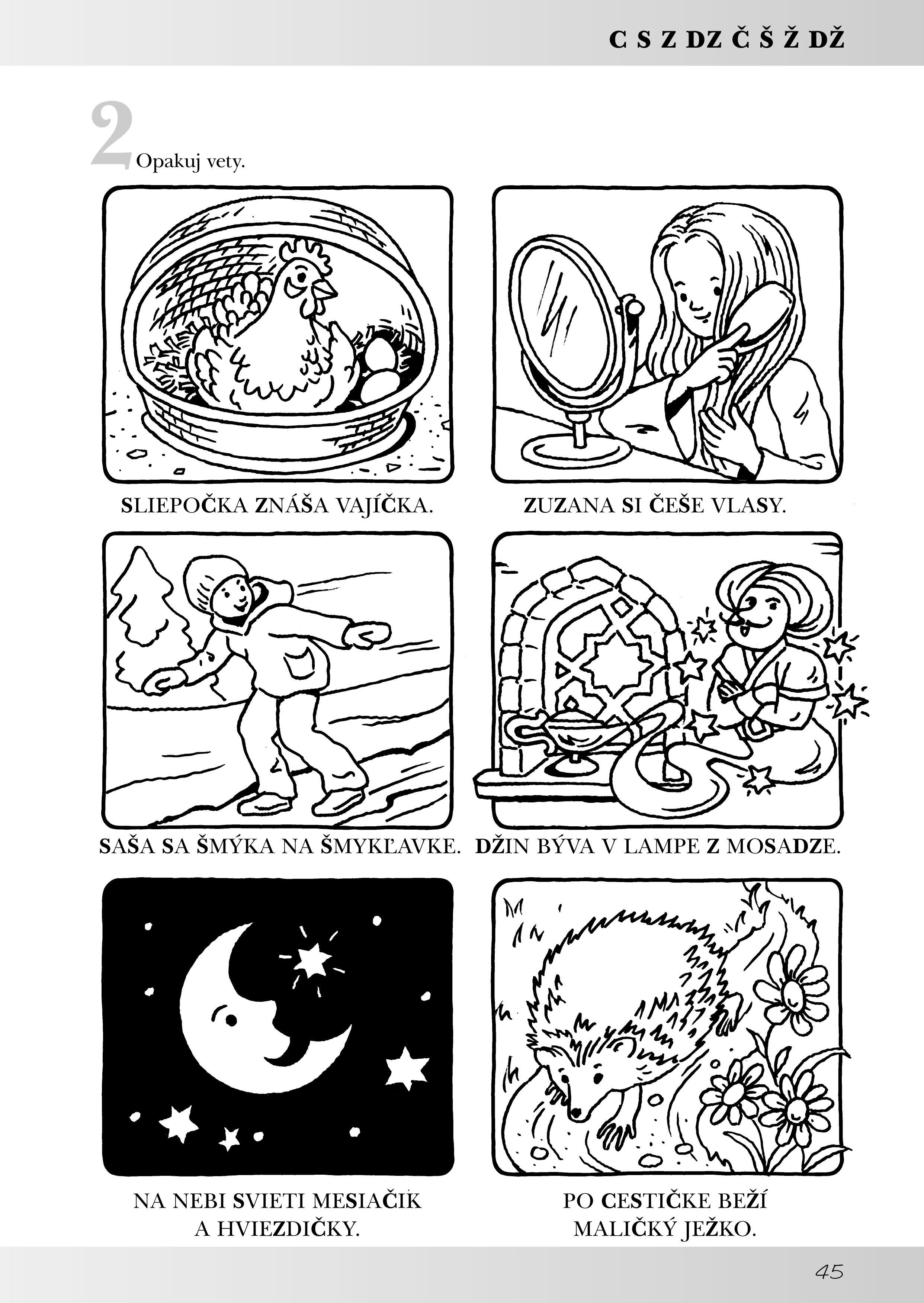 V prvej časti knihy sú úlohy na precvičovanie hlások, s ktorými mávajú deti najväčšie problémy – Ď, Ť, Ň, L, C, S, Z, DZ, Č, Š, Ž, DŽ, R. Nácvik prebieha najskôr pomocou slov, viet, opisu deja na obrázku, potom sa deti naučia básničku a nakoniec urobia grafomotorické cvičenie, ktoré sa vzťahuje k básničke.