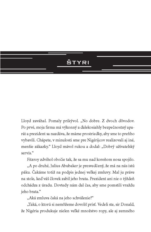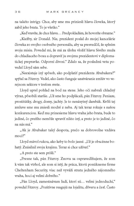 Kniha, pri ktorej od napätia zabudnete aj dýchať. Greaneyho románový debut predstavuje záhadného nepolapiteľného Courta Gentryho, bývalého príslušníka CIA a dnes legendárneho nájomného vraha. Muž s desivou schopnosťou zabíjať a striktným morálnym kódexom sa ticho presúva z jednej akcie do druhej, ale keď sa proti nemu obrátia jeho bývalí zamestnávatelia aj jeho vláda, nezostane mu žiadna úniková cesta ani bezpečný úkryt. Gentry sa pustí na zúfalý útek naprieč Stredným východom aj Európou – proti nemu sú mocní nepriatelia a najmä čas.