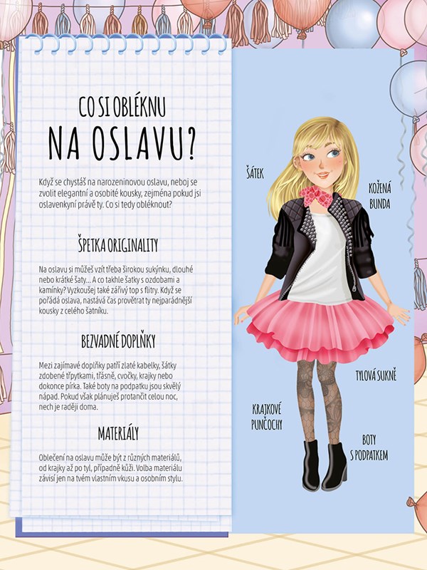 Baví tě móda? Pak je tato knížka právě pro tebe! Ukaž, co je v tobě, a předveď se jako šikovná módní návrhářka. Použij super stylové samolepky a navrhni vlastní slušivé oblečky na narozeninovou oslavu a letní prázdniny.