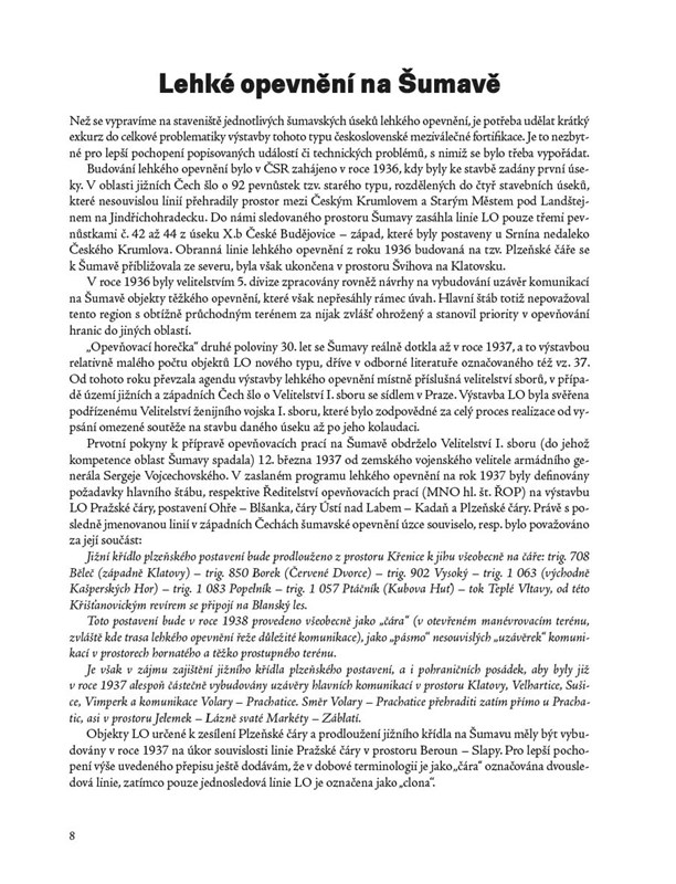 Šumava. Zalesněné pohoří na jihozápadě Čech dodnes láká návštěvníky na mnohá tajemná a zapomenutá místa. Na loukách nebo hluboko v šumavských hvozdech stojí mimo jiné stovky pevnůstek předválečného lehkého opevnění, které jsou dodnes němými svědky odhodlání k obraně národa před nacistickou expanzí v roce 1938. Tato kniha přináší vůbec poprvé komplexní zpracování historie šumavských řopíků od jejich výstavby až po německou okupaci v letech 1938–45. Kniha těží především z rozsáhlých archivních pramenů, které umožnily dobře rekonstruovat nejen celý proces výstavby šumavského obranného valu, ale také přibližuje další související témata jako vybavení, výzbroj, střežení či obsazení opevnění. V knize rovněž ožívají dávno zapomenutá jména prvorepublikových vojáků, stavitelů nebo obyčejných dělníků či obyvatel Šumavy, kteří se na výstavbě opevnění podíleli. Publikace doplňují stovky dobových fotografií, které nebyly z velké části dosud publikovány a také množství reprodukcí či přepisů dobových dokumentů.