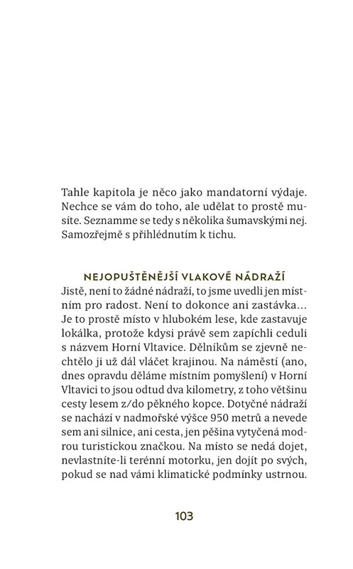 Šumava tajemná, romantická a umírající? Tak ji znají všichni. Co takhle Šumava k smíchu? Právě do ní vás zavede první nekorektní antiprůvodce nejrozsáhlejším českým pohořím. Jeho autorem je Aleš Palán, známý jako Ten, který mluvil se samotáři. O Šumavě napsal knihu rozhovorů, esejů i román. Chyběl mu už jen ten průvodce. V něm se dozvíte i to, co jste vědět nechtěli. Proč je totemovým zvířetem Šumavy slon a největším místním smolařem Milouš Jakeš, že nejděsivější místo se nazývá Pohádka, podle čeho na první pohled poznáte cestující do Horní Vltavice, do které obce není zavedena elektřina a kde žijí samotáři. No tak vidíte.