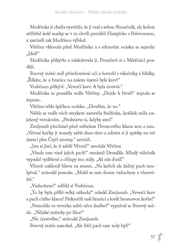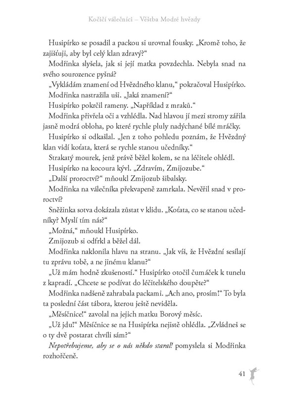Napětí mezi kočičími klany v lese stoupá a Hromový klan musí dokázat, že je dostatečně silný. Do této nejisté doby se v klanu rodí pozoruhodné kotě. Jak čas plyne, stává se z malé kočičky skvělá válečnice a posléze uznávaná velitelka Hromových. Modrou hvězdu ale stíhá temná věštba, podle níž jí hrozí smrt ve spárech jediného nepřítele, kterému se nedokáže vyrovnat. Tajemství z minulosti vyplouvají na povrch… a nebezpečí skrývající se ve stínech může zaútočit každým okamžikem.