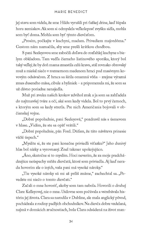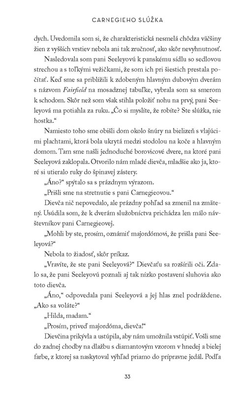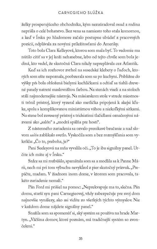 Slúžiť ako komorná v domácnosti Andrewa Carnegieho a vyhovieť jeho panovačnej matke, ktorá vládne svojmu panstvu a synom železnou rukou, však nie je jednoduché. No Clare nechýba odhodlanie a silná vôľa a svojím úsilím a inteligenciou dosiahne, že sa na ňu čoskoro začne spoliehať nielen pani Carnegieová, ale aj jej starší syn.