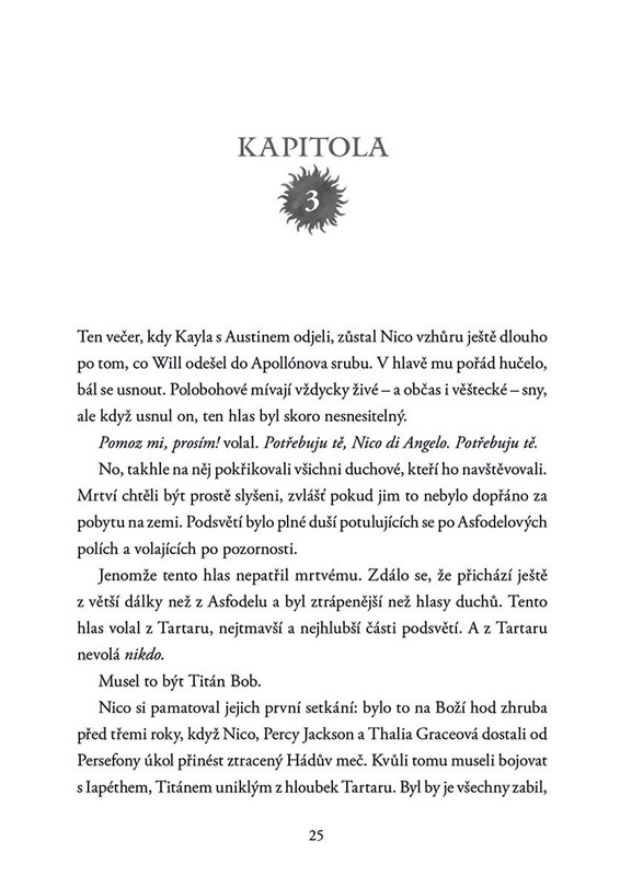 Nico di Angelo jako Hádův syn zažil víc hrůz než kdokoli jiný. Ale i jeho dny prosvětlil paprsek slunce v podobě milovaného Willa Solace, Apollónova syna. Spolu dokážou překonat jakoukoli překážku. Poslední dobou ale Nika volá hlas z Tartaru. Zdá se, že patří napravenému Titánovi, kterého Percy s Annabeth museli opustit během úniku z Hádovy říše. Nico se mu hodlá vydat na pomoc a Will trvá na tom, že ho doprovodí. Přežije ale bytost světla v nejtemnější části podsvětí? A čeho se tam Nico bude muset vzdát?