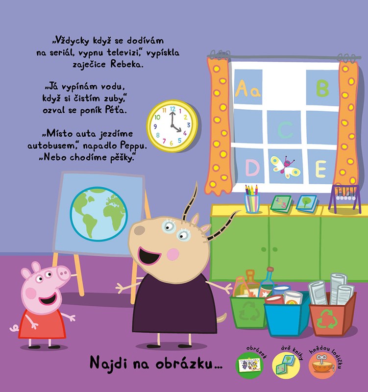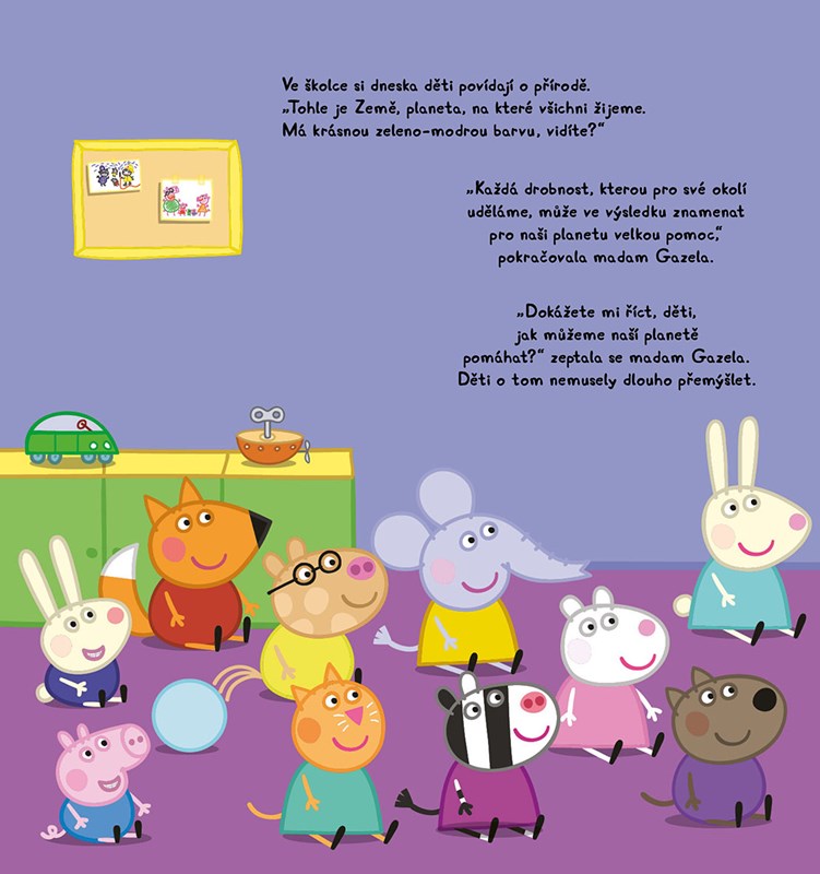 Krásně ilustrovaným příběhem plným zábavy a poučení vás provede rodina Prasátkových.Peppa s kamarády prozradí, jak můžeme společně chránit životní prostředí kolem sebe. Na každé straně najdete aktivitu spojenou s trénováním postřehu. Děti se naučí poznávat základní čísla a barvy. S prasátkem Peppou a jejími kamarády je učení zábava!