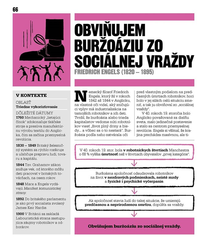 Prehľadná, informačne nabitá, vhodná na čítanie stranu za stranou, ale aj skokovité čítanie podľa tém alebo osobností, ktoré vás práve zaujímajú. Výhodou je, že v rámci listovania vám môžu do očí padnúť rôzne obrazové schémy a grafy s minimom popisu a vzbudiť vo vás záujem prečítať si viac. Alebo aj nie. Taktiež je takmer na každej dvojstrane vypichnutý nejaký citát, prípadne myšlienka, ktorá tvorí titulok danej časti. Vďaka rámčekom V kontexte či medailónikom osobností získate širšie súvislosti.