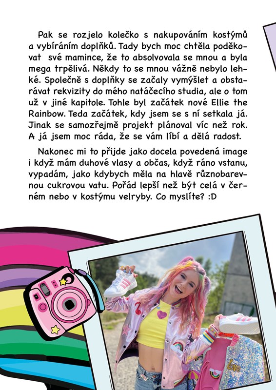 Já jsem Ellie the Rainbow! Zpívám, tančím, točím videa, nahrávám videoklipy a dělám spoustu dalších věcí! Jsem duhová, praštěná, ale i obyčejná holka! A ty právě držíš v ruce knížku, kterou jsem si vždycky přála vydat. Takovou knížku neknížku. Je to trochu knížka, trochu deníček, trochu skicák, trochu doplňovačka… A to vše budeme tvořit společně!