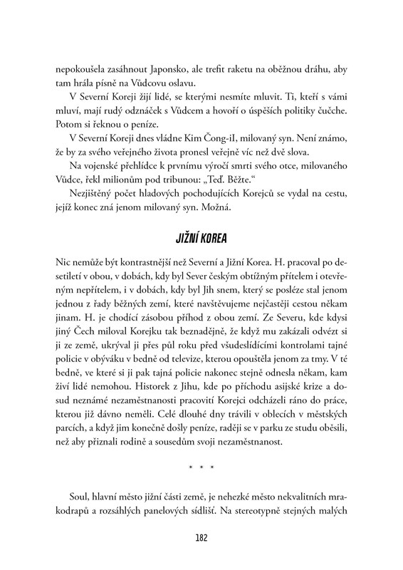 Navštívíte s ním mj. Nigérii, která se teď stává třetí nejlidnatější zemí na světě, kmenová území Pákistánu ještě v době, než se jméno místního podnikatele bin Ládina stalo obecně známým pojmem, Egypt, Etiopii, Zimbabwe, Mongolsko nebo Mali tak, jak je turista nikdy nemůže poznat. Projdete si nostalgií ostrovů Indického oceánu i tragédiemi asijského konfuciánského komunismu. Na cestách potkáte nejednoho státníka či diktátora tak, jak jste o nich nikdy dříve neuvažovali. Nechybí ani zvláštní osamělý muž – Jásir Arafát.
