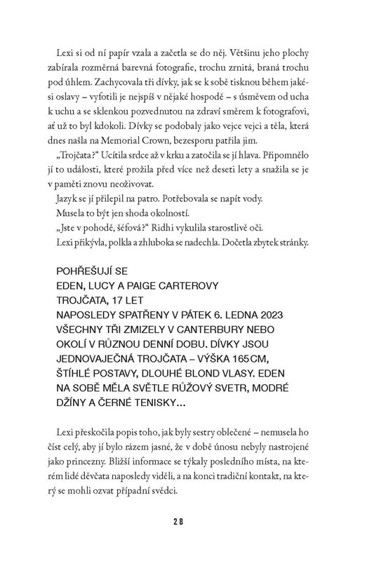 Kdesi v Canterbury leží na ztichlé stráni dvě dívky. Ve vlasech mají diadém, každá v ruce svírá rudou růži. Mohlo by se zdát, že spí… ale mají podříznutá hrdla. Policie záhy zjistí, že jde o dvě ze tří sester a ta poslední se pohřešuje. Pro inspektorku Lexi Bennettovou je mrazivý případ osobní. Před lety totiž ji i její dvě sestry stihl podobný osud. Vrátil se muž, který je v mládí unesl? Při pátrání po identitě vraždícího netvora se inspektorka každou minutou noří hlouběji do temnoty. A čas je proti ní.