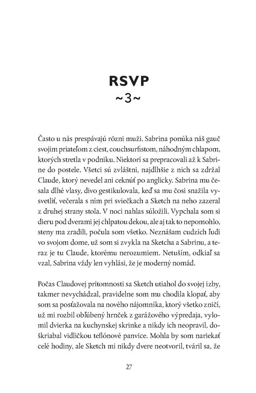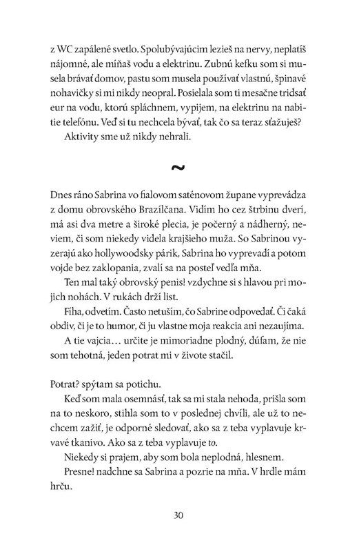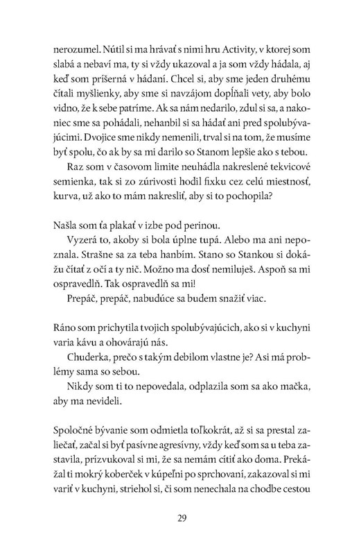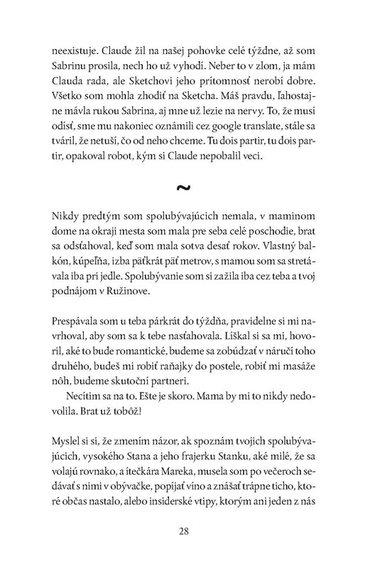 „Znova ma začali trápiť nočné mory. Zaspím pokojne, ale budím sa spotená, s krikom alebo s plačom. V snoch som často v Bratislave, rutinne opakujem rôzne činnosti a mám sklený pohľad, väčšinou sa na seba pozerám z výšky. V snoch sa objavuješ aj ty. Držíš mi hlavu pod hladinou vody, plávajú popri mne Sketchove mŕtve ryby a ja nemôžem dýchať.“