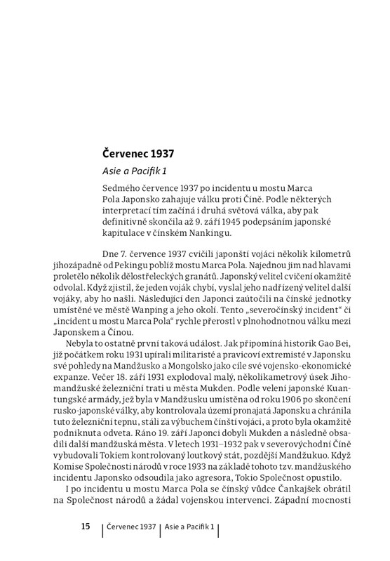 Výročí osmdesáti let od konce druhé světové války je příležitostí k připomenutí si některých méně známých souvislostí tohoto celosvětového konfliktu. Historik a úspěšný popularizátor Jan Adamec tak činí formou kroniky – měsíc po měsíci sleduje válečné roky a události na jednotlivých bojištích, ale i v dalších částech světa, které ničivý globální konflikt zasáhl. Poněkud netradičně nezačíná své líčení v září 1939, ale o dva roky dříve, kdy Japonsko po incidentu na mostu Marca Pola 7. července 1937 zahájilo válku proti Číně. Pozornost na asijská, tichomořská a africká bojiště rovnoměrně doplňuje nejznámější válečné střety na evropské západní a východní frontě. Kromě samotných válečných akcí se bohatě dostává i na diplomacii, která ani v době válečného konfliktu samozřejmě neustala. Poutavá kniha dává nahlédnout do mnoha méně známých souvislostí druhé světové války.