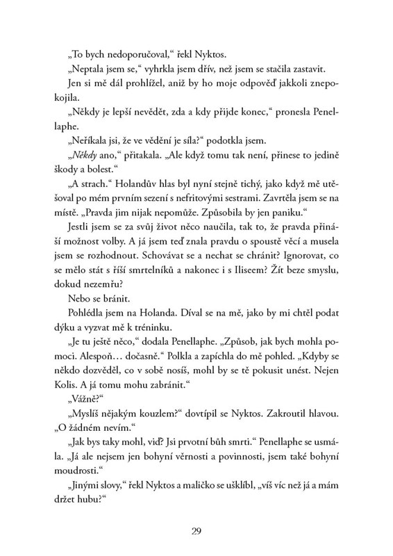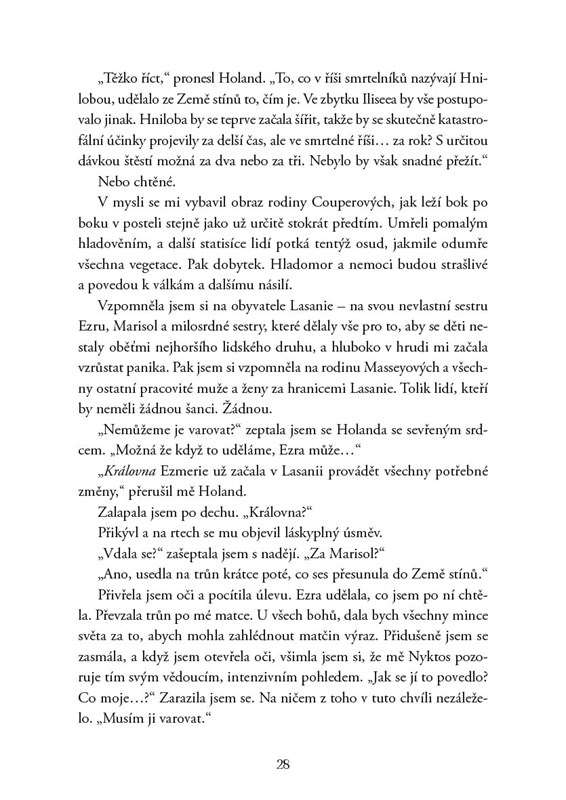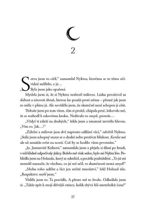 Pravda o Seřině plánu vyšla najevo a narušila křehkou důvěru mezi ní a Nyktem. Teď musí udělat všechno, aby zničila Kolise, falešného krále bohů. Nyktos má ale svůj vlastní plán a Sera si nemůže dovolit zamilovat se do zmučeného prvotního boha smrti. Vzpomínek na jejich společnou rozkoš se ale nelze jen tak zbavit. Když je oba Kolis povolá ke svému dvoru, objeví se zcela nové riziko. Prvotní síla života v Seře roste a bez Nyktovy lásky své povznesení nepřežije. Čas se krátí. Jak pro ni, tak pro celé říše.