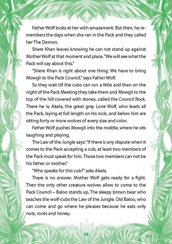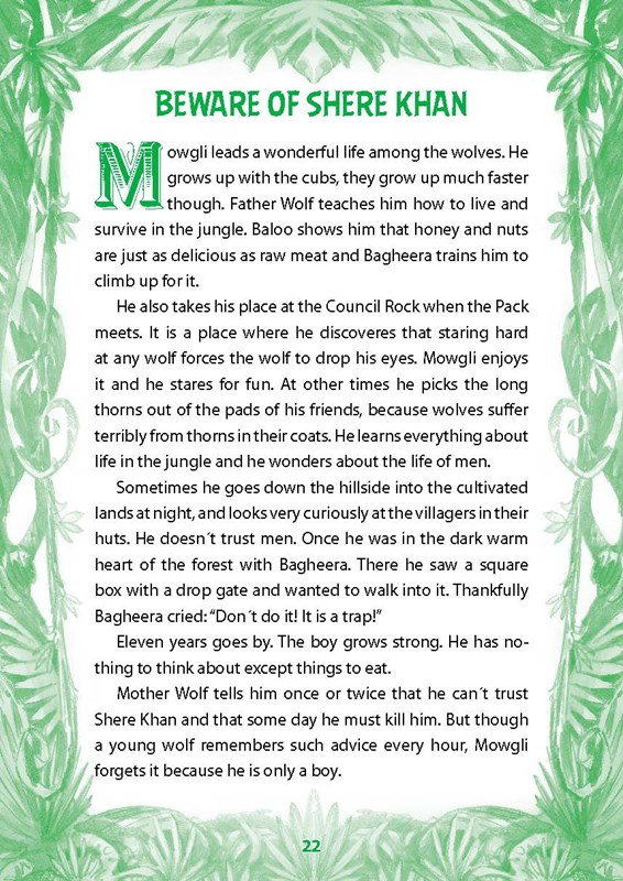 Príbeh o Mauglím je spracovaný pre začínajúcich čitateľov, ktorí si chcú vyskúšať, ako si poradia so súvislým textom v angličtine. Úroveň jazyka v publikácii je vhodná pre začiatočníkov a mierne pokročilých študentov. Slovenský zrkadlový preklad čitateľovi umožní obratom skontrolovať, či cudzojazyčnému textu správne porozumel. Cvičenia na konci knihy sú vhodné na overenie základných znalostí.