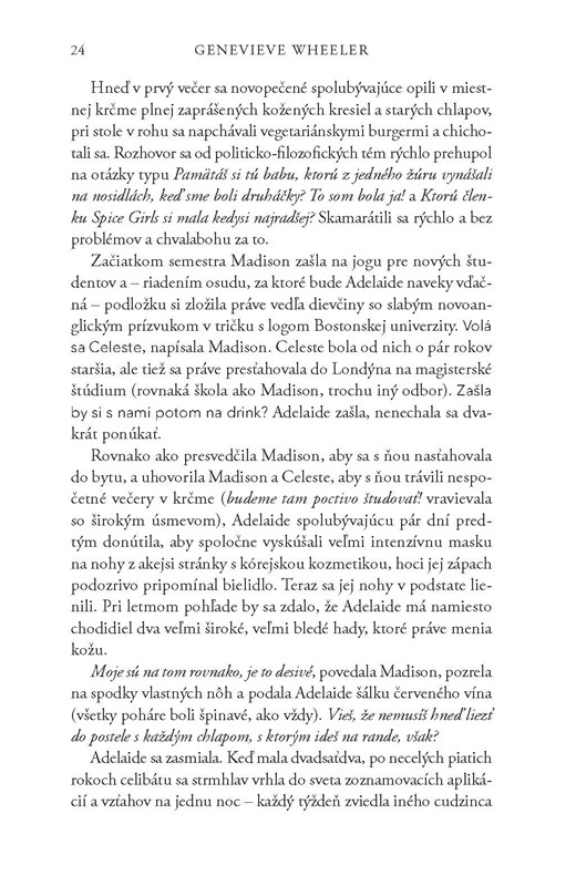 Román pre fanúšikov Sally Rooney či Colleen Hoover, ktorý dokonale zabrnká na strunu generácie mileniálov. Genevieve Wheeler s neúprosnou úprimnosťou a humornou hrejivosťou zachytáva nadčasovú výzvu čeliť životu – a láske – so všetkými jeho nedokonalosťami.