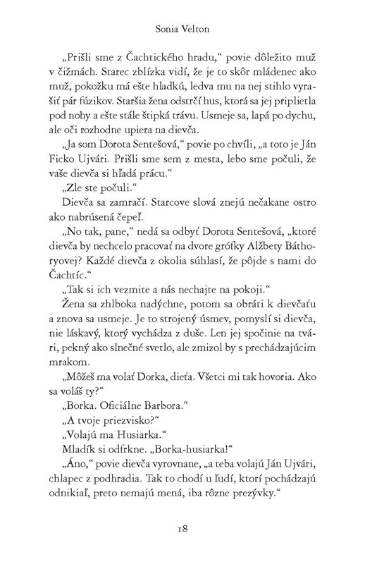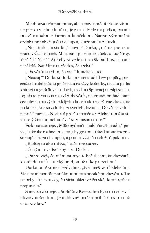 Autorka vykresľuje postupnú premenu ich vzťahu, od chladného odstupu po neisté porozumenie. Keď sa začne súd s Báthoryovou pre sériu údajne sadistických vrážd, Borka stojí pred ťažkým rozhodnutím: postaví sa na stranu ženy, ktorá ju porodila, alebo sa stane svedkom jej pádu?