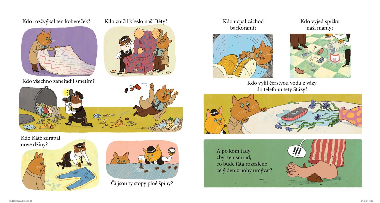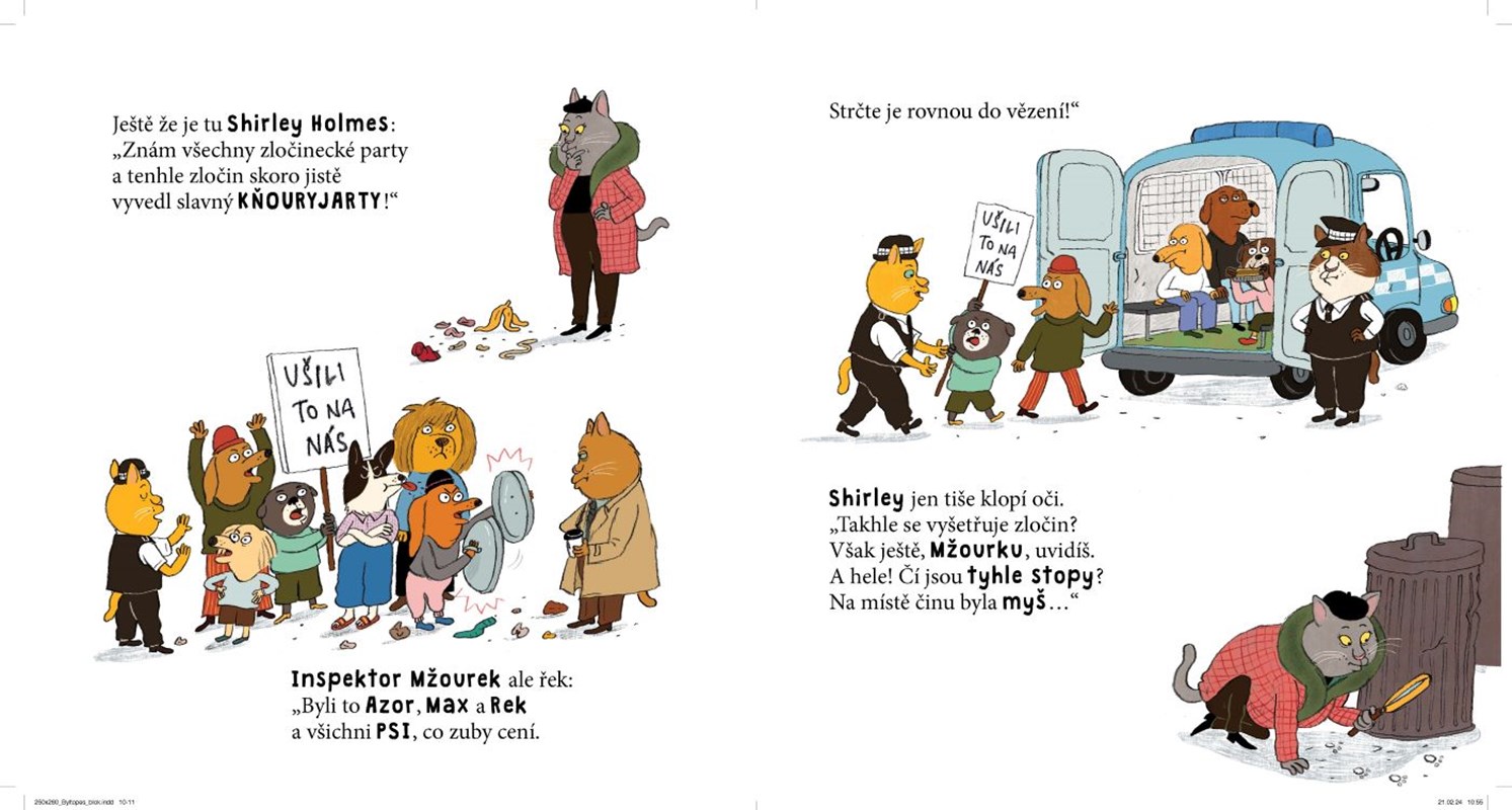 Dnes v noci řádil ve městě zločinec: křeslo rozcupoval na kusy, zablátil postele a na podlaze v kuchyni nechal něco moc ošklivého. Inspektor Mžourek má hned jasno: viníkem je PES. Strčte je všechny do vězení! Královna všech detektivů Shirley Holmes má však jiný názor. V tom má jistě pracky padouch Kňouryjarty! Podaří se jí usvědčit skutečného viníka, anebo si to odskáčou psi?