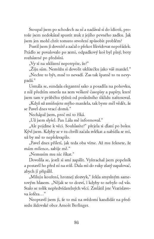 Krátce před dramatickou volbou předsedy Židovské obce je na starém židovském hřbitově na Žižkově nalezena mrtvola mladé ženy. O několik dnů později umírá násilnou smrtí v domově pro přeživší holocaustu manželka jednoho z kandidátů na předsedu. Souvisejí spolu tyto dva zločiny a mají spojitost s probíhající přípravou voleb? Vedou i tentokrát stopy k tragickým událostem druhé světové války? Soukromý detektiv se svým podivínským pomocníkem se snaží rozplést vztahy mezi členy židovské obce a zároveň vést vyšetřování souběžně s policejním týmem.